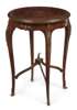 the circular brass bound top with floral and scroll marquetry over a serpentine frieze, raised on slender cabriole legs joined by arched stretchers and ending in sabots