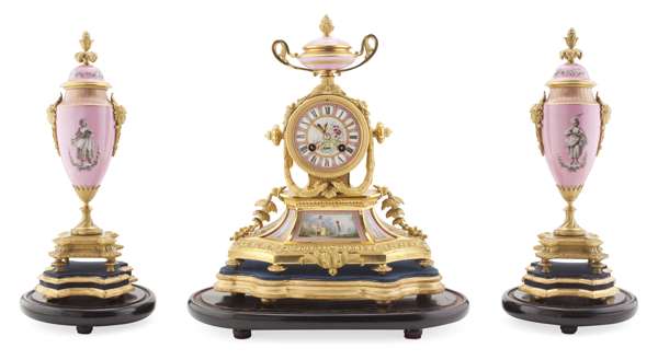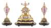 LOUIS XV STYLE GILT BRONZE AND PINK GROUND PORCELAIN CLOCK GARNITURE