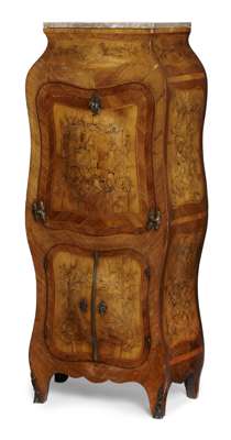 with gilt metal mounts, the later marble top above a fall front enclosing a fitted interior with pigeon holes, drawers and an inset writing surface; the lower part with two cupboard doors, raised on squat cabriole legs ending in sabots