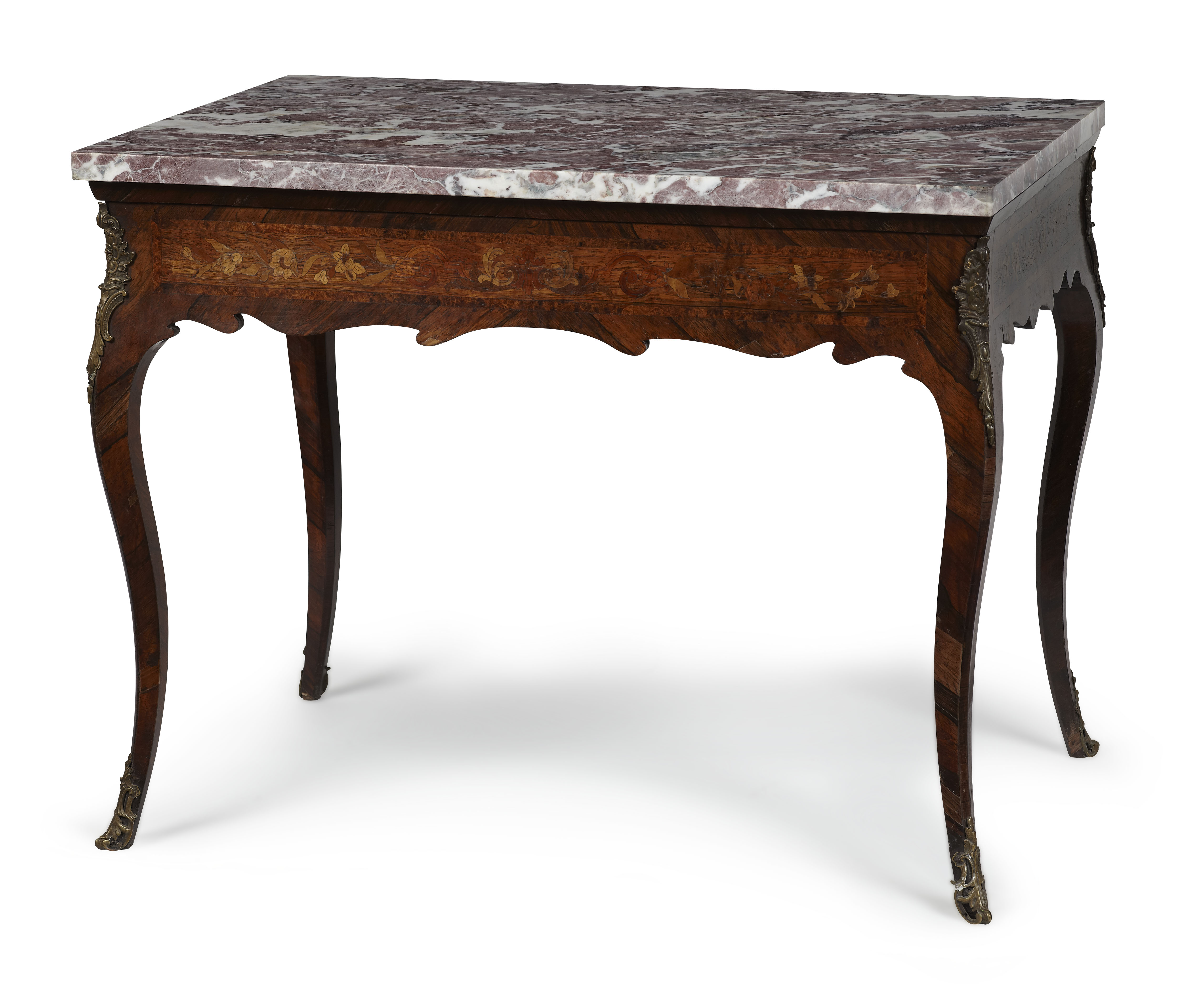 LOUIS XV STYLE ROSEWOOD, KINGWOOD AND MARQUETRY MARBLE TOP SIDE TABLE