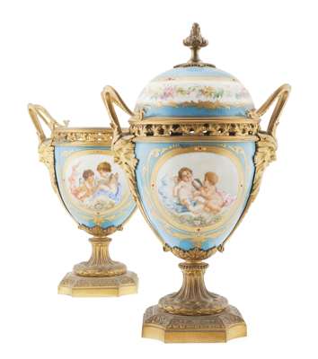 PAIR OF LOUIS XVI SEVRES STYLE GILT BRONZE MOUNTED URNS