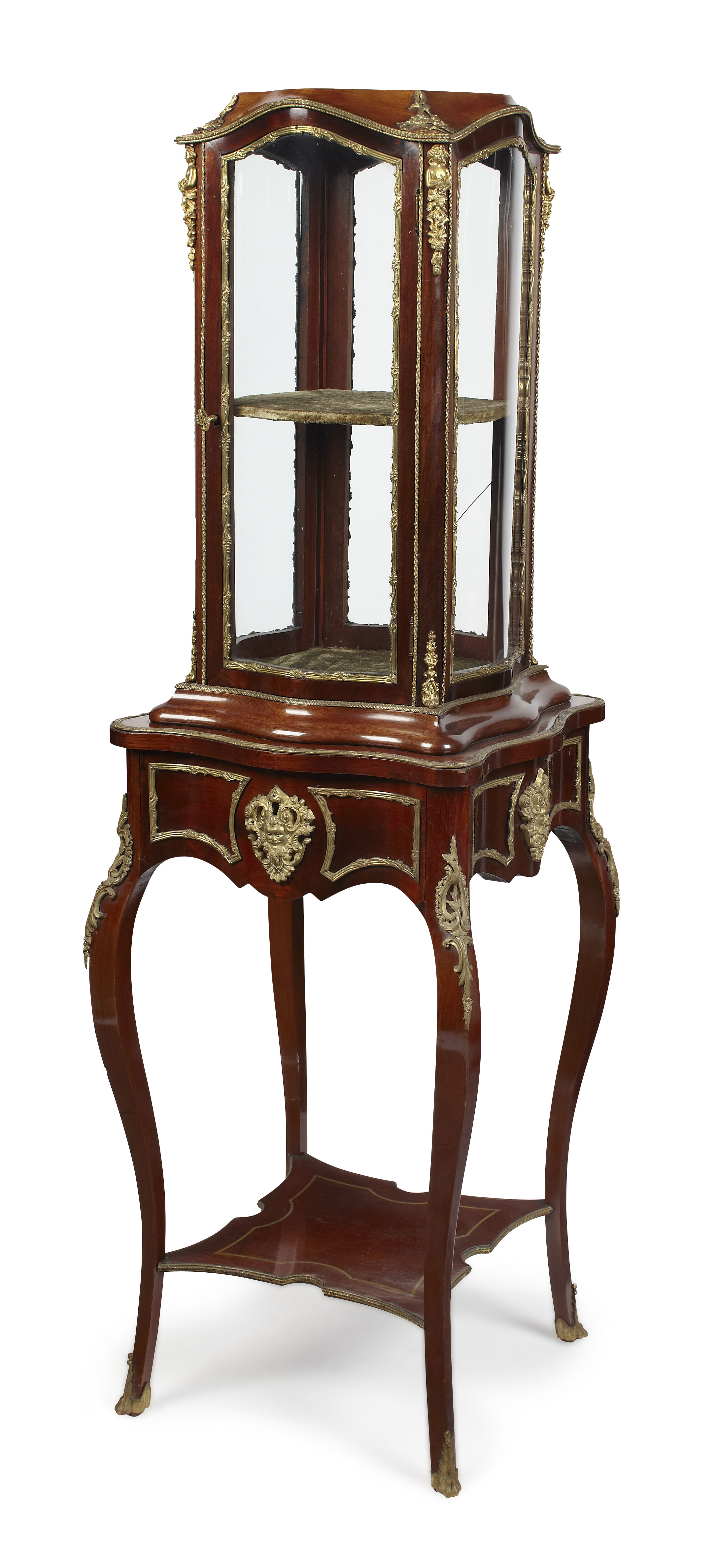 LOUIS XV STYLE MAHOGANY AND GILT METAL MOUNTED VITRINE ON STAND