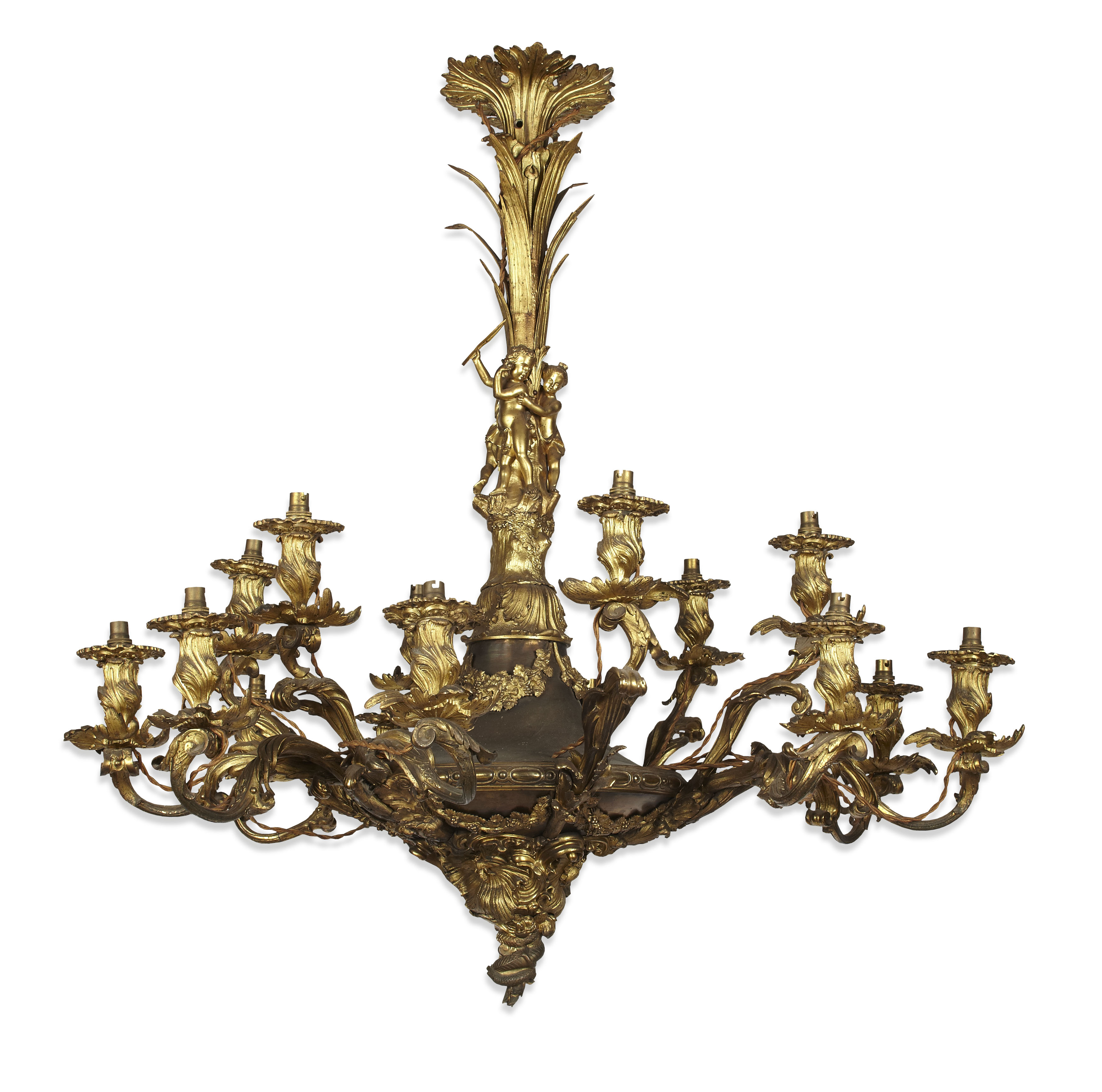 the stem modelled as three cherubs clutching bullrushes, the central reservoir with applied rococo mounts cast with fruiting vines, shells, butterflies and a serpent and issuing fifteen outscrolling naturalistic candle arms, fitted for electricity