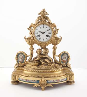 the white enamel dial with a bell striking 8-day movement, surmounted by a flowering basket and raised on twin rams' mask scroll supports inset with oval Sevres style portrait medallions, centred by two playful putti and raised on a breakfront platform base ending in toupie feet