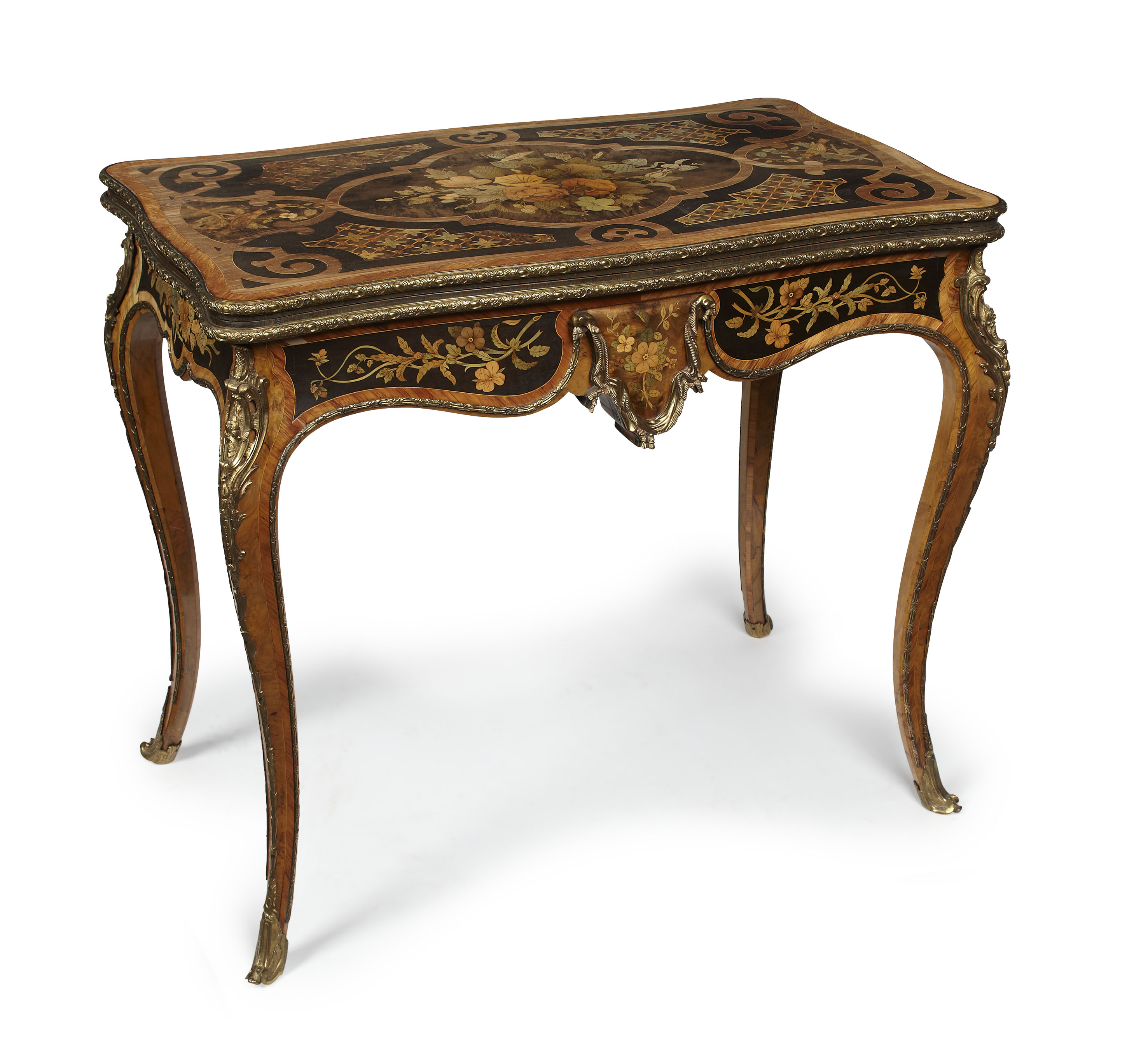 LOUIS XV STYLE KINGWOOD, AMARANTH, ACAJOU AND MARQUETRY GILT BRONZE MOUNTED GAMES TABLE