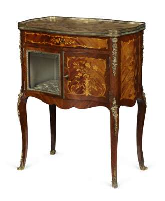 the shaped rectangular breche marble top with a three quarter pierced brass gallery over a single drawer above a pair of doors, one glazed and opening to a pale blue silk lined interior, the other with floral marquetry; raised on square cabriole legs with gilt metal mounts and sabots