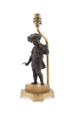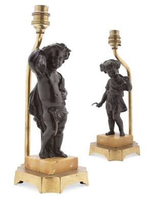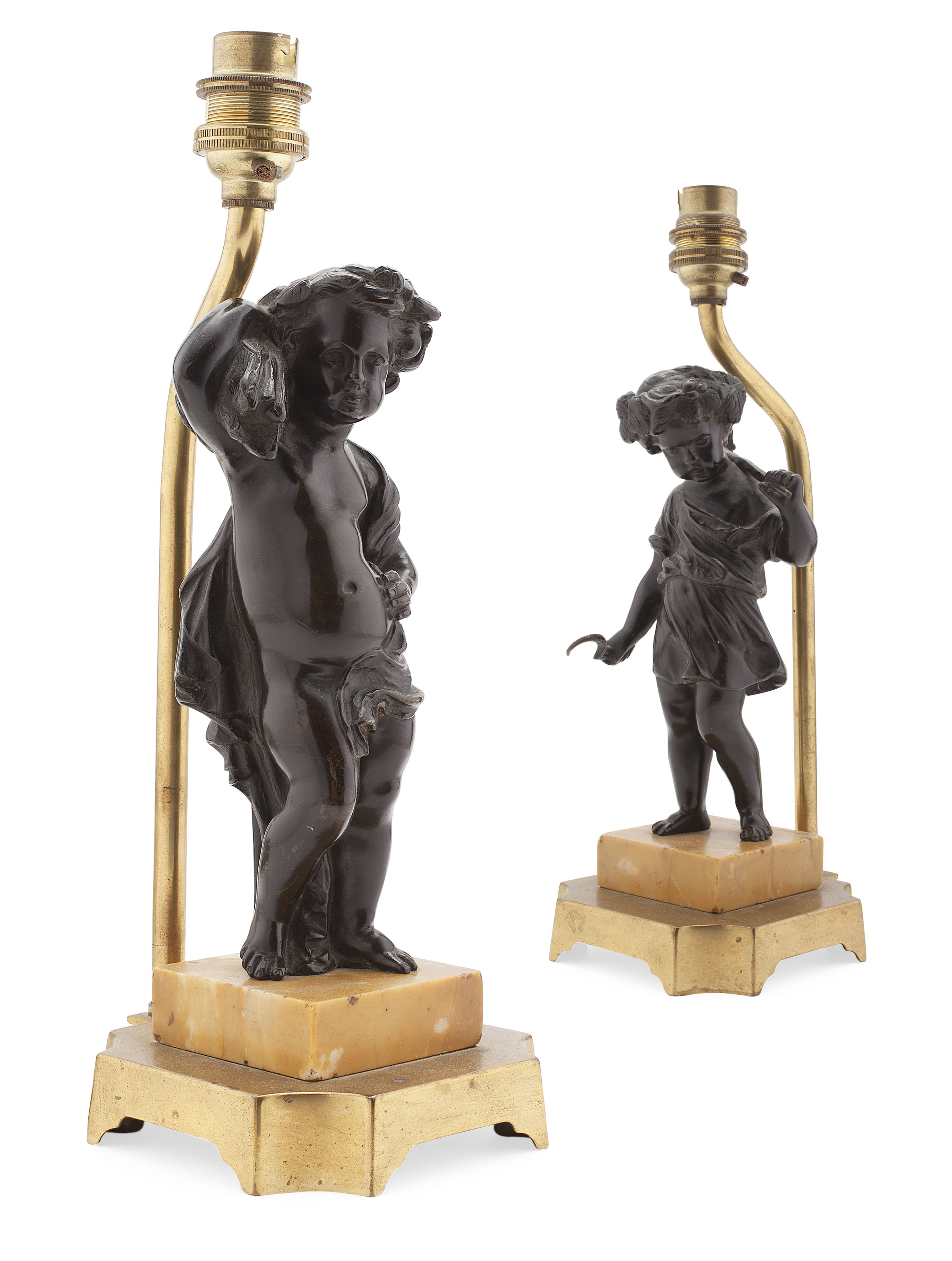 bronze, dark brown patina, modelled as a putti emblematic of Summer and Autumn, raised on Sienna marble bases, signed Moreau, fitted as lamps (2)