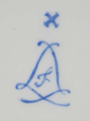 painted with garlands and roses on a pink striped ground with gilt details, interlaced blue mark, the porcelain possibly earlier