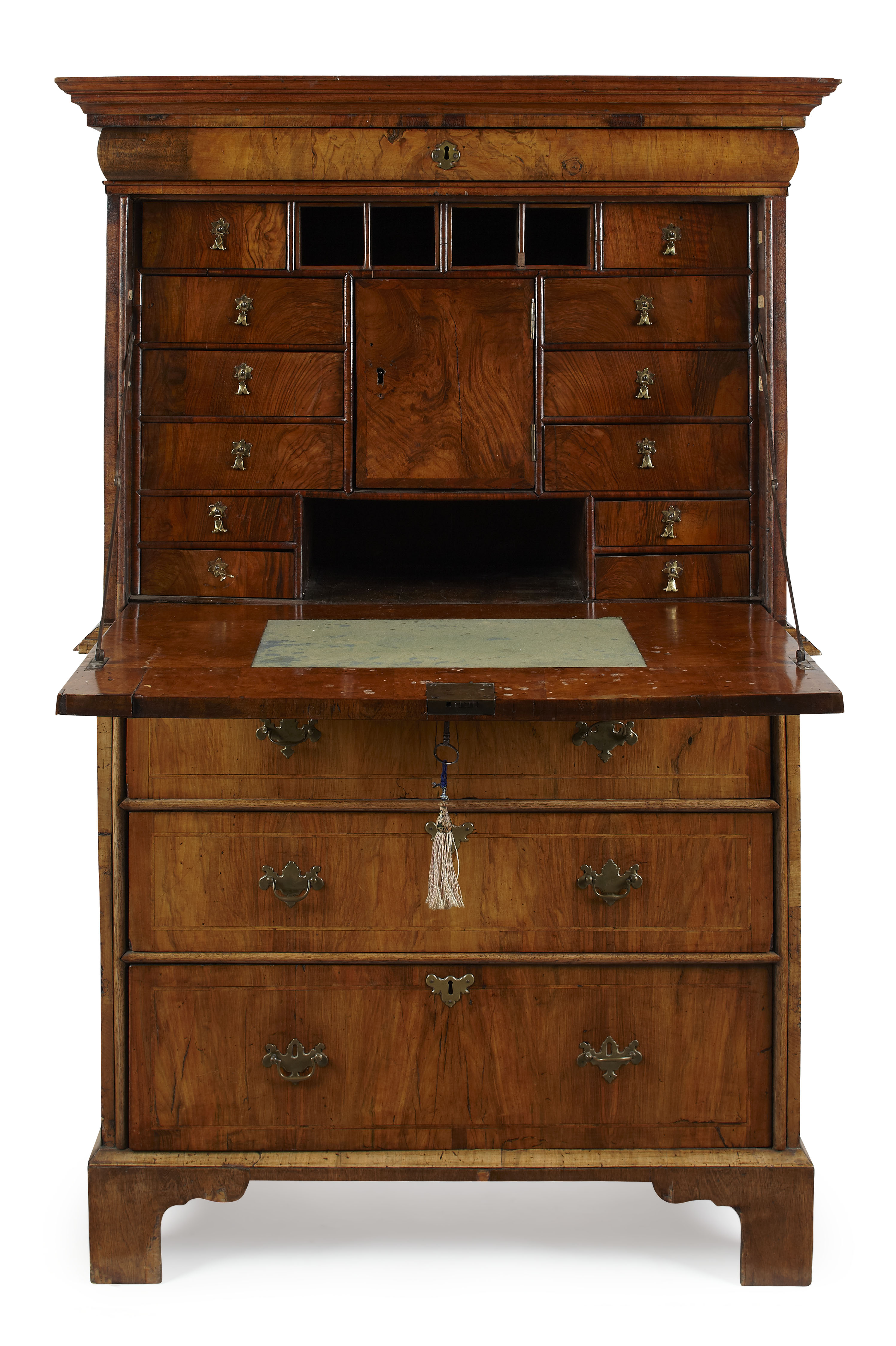the moulded cornice above an ogee moulded frieze drawer and fall front, opening to reveal a fitted interior with pigeon holes, drawers and an inset baize writing surface, over three long graduated drawers, raised on bracket feet