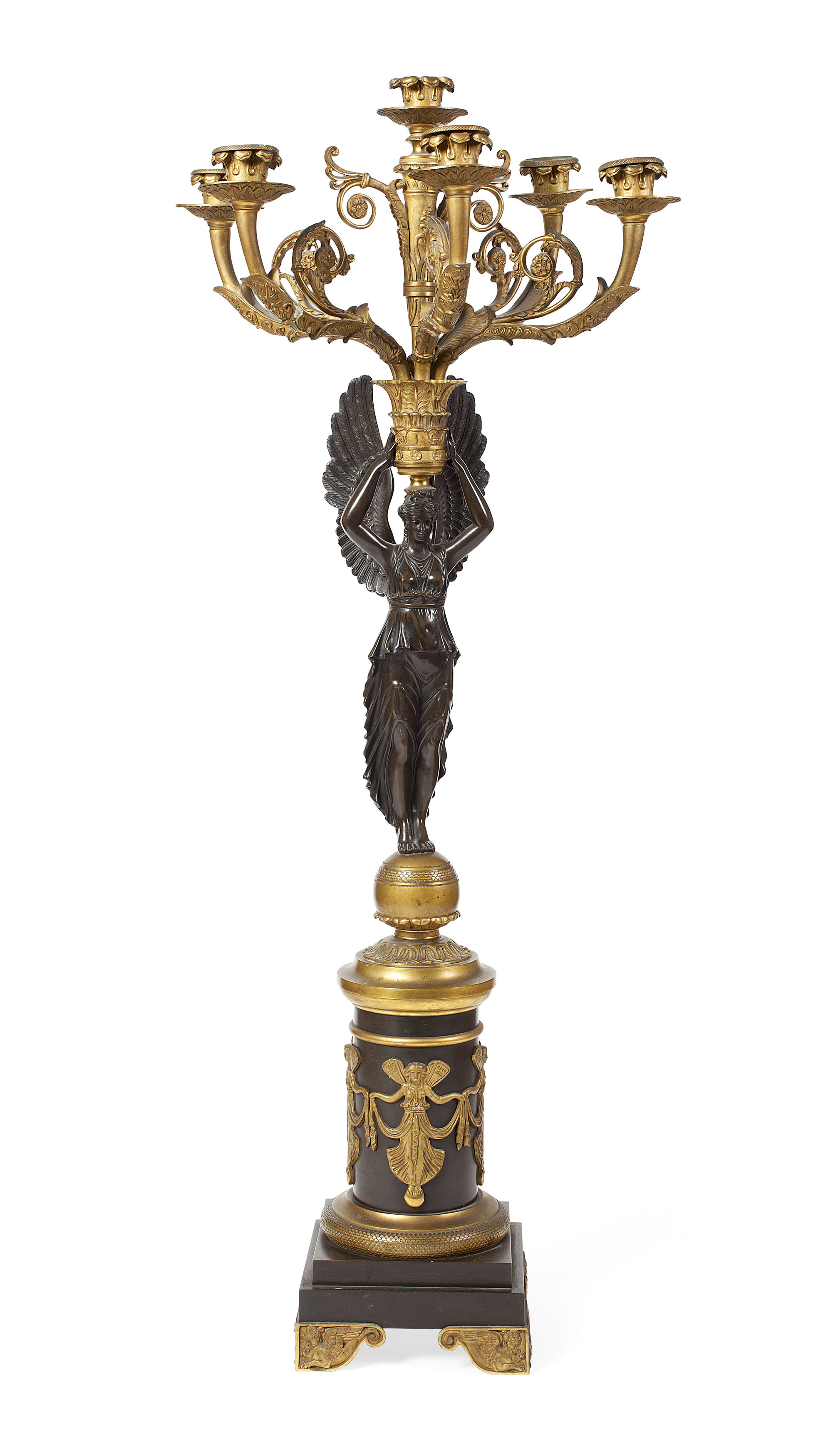 LARGE EMPIRE GILT AND PATINATED BRONZE FIGURAL CANDELABRUM
