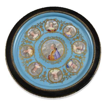the top inset with a circular Sevres style porcelain plaque centrally painted with a portrait of Louis XVI encircled by smaller oval portraits of ladies of the court, on a bleu celeste ground, in an ebonised frame raised on a column support and quatreform base with gilt metal mounts