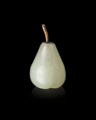 of pear form, the cover made as a gold stem mounted with a rose-cut diamond and enamelled leaves, maker's stamps to the brush stem