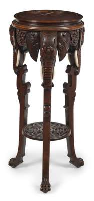 the circular rouge marble top raised on three elephant mask carved supports with ivory tusks, united by a fret pierced undertier and ending in carved paw feet