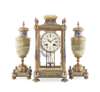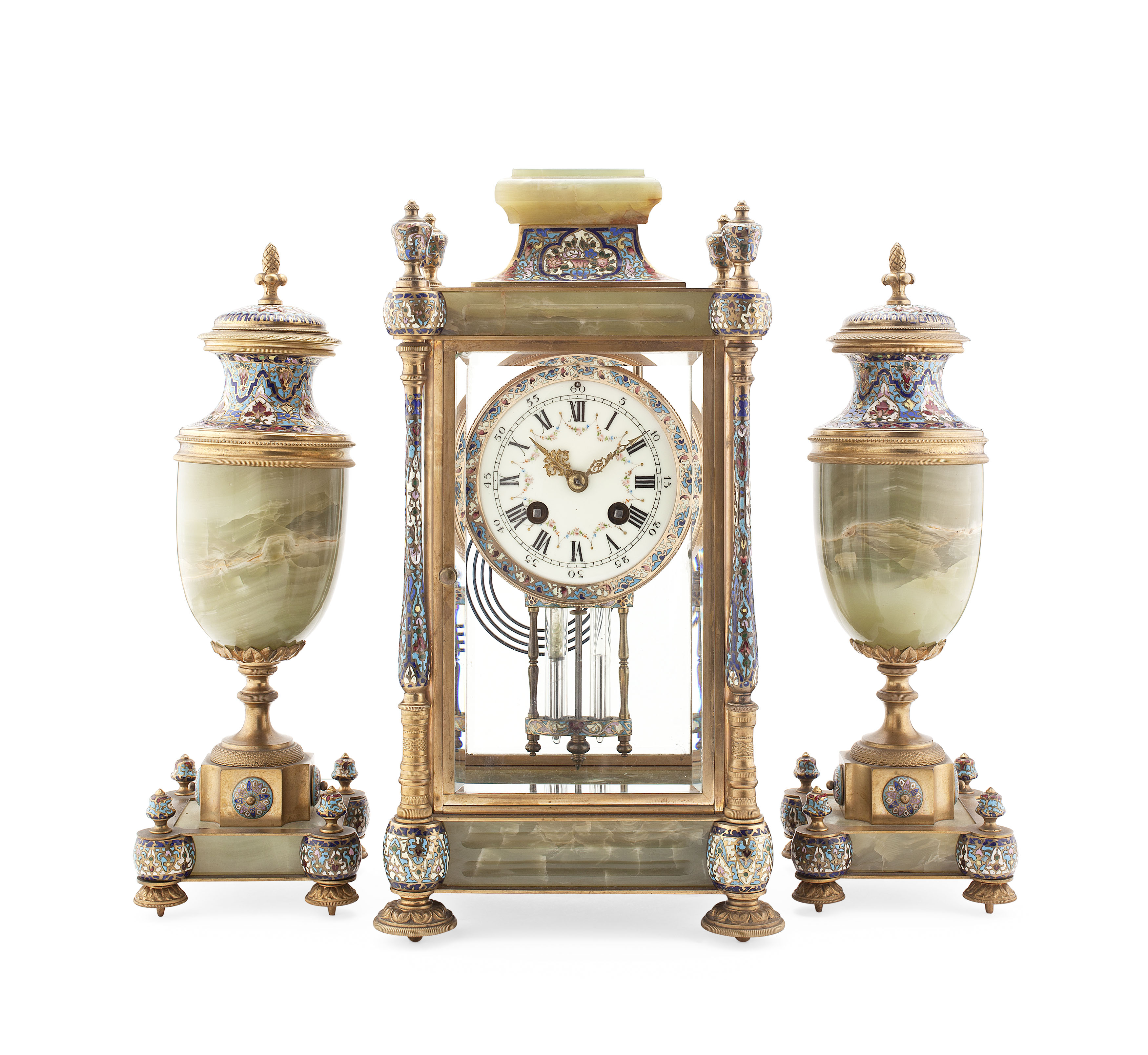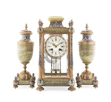 FRENCH ONYX GILT BRASS AND CHAMPLEVE CLOCK GARNITURE