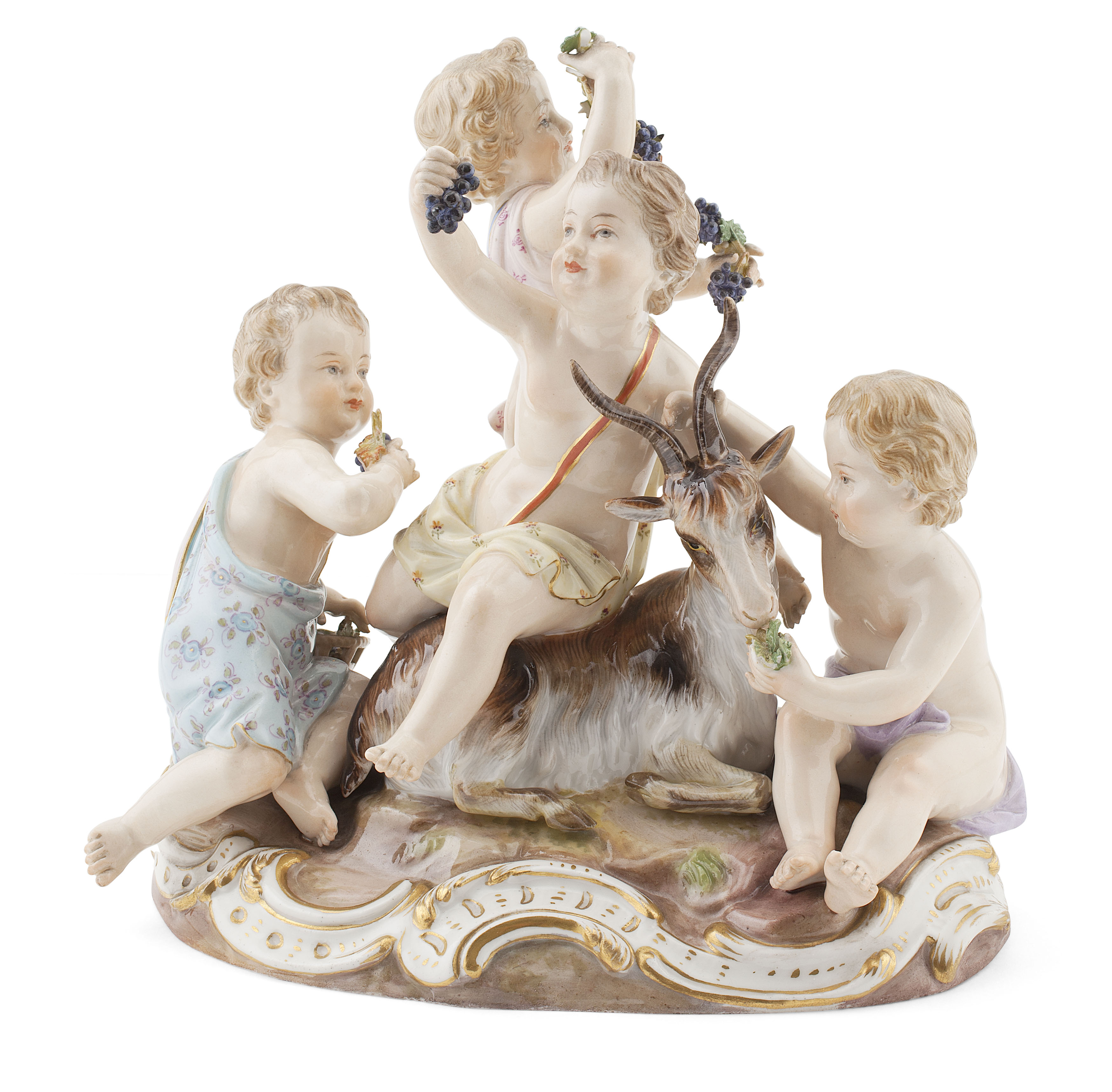 emblematic of Autumn, modelled with four putti holding bunches of grapes, seated and standing on a grassy mound with a recumbent goat, blue cross sword mark
