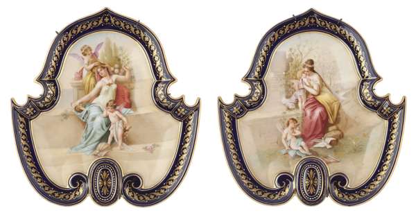 each painted with a romantic scene of a young beauty with cupid and a cherub in a walled garden within cobalt gilt enhanced borders, signed 'A. Forster', blue beehive marks (2)