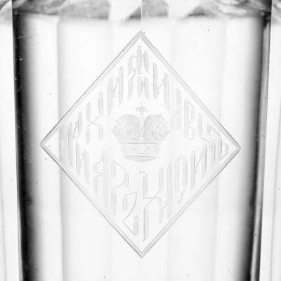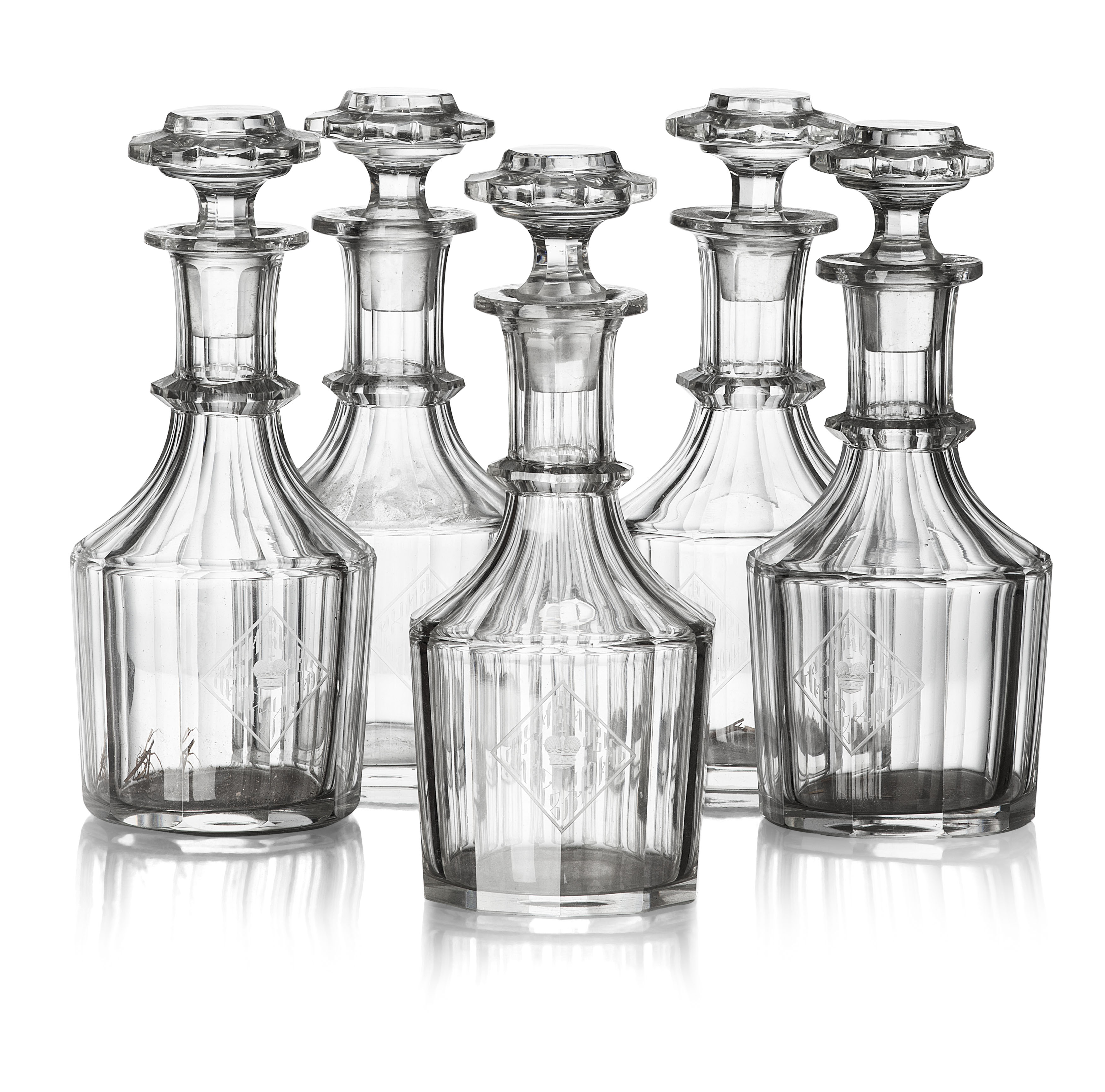 facetted mallet form with a ring banded neck, engraved with an Imperial lozenge-shaped cypher in Cyrillic; with associated flattened lobed stoppers (5)