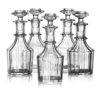 FIVE RUSSIAN IMPERIAL GLASS WORKS DECANTERS FROM A BANQUET SERVICE