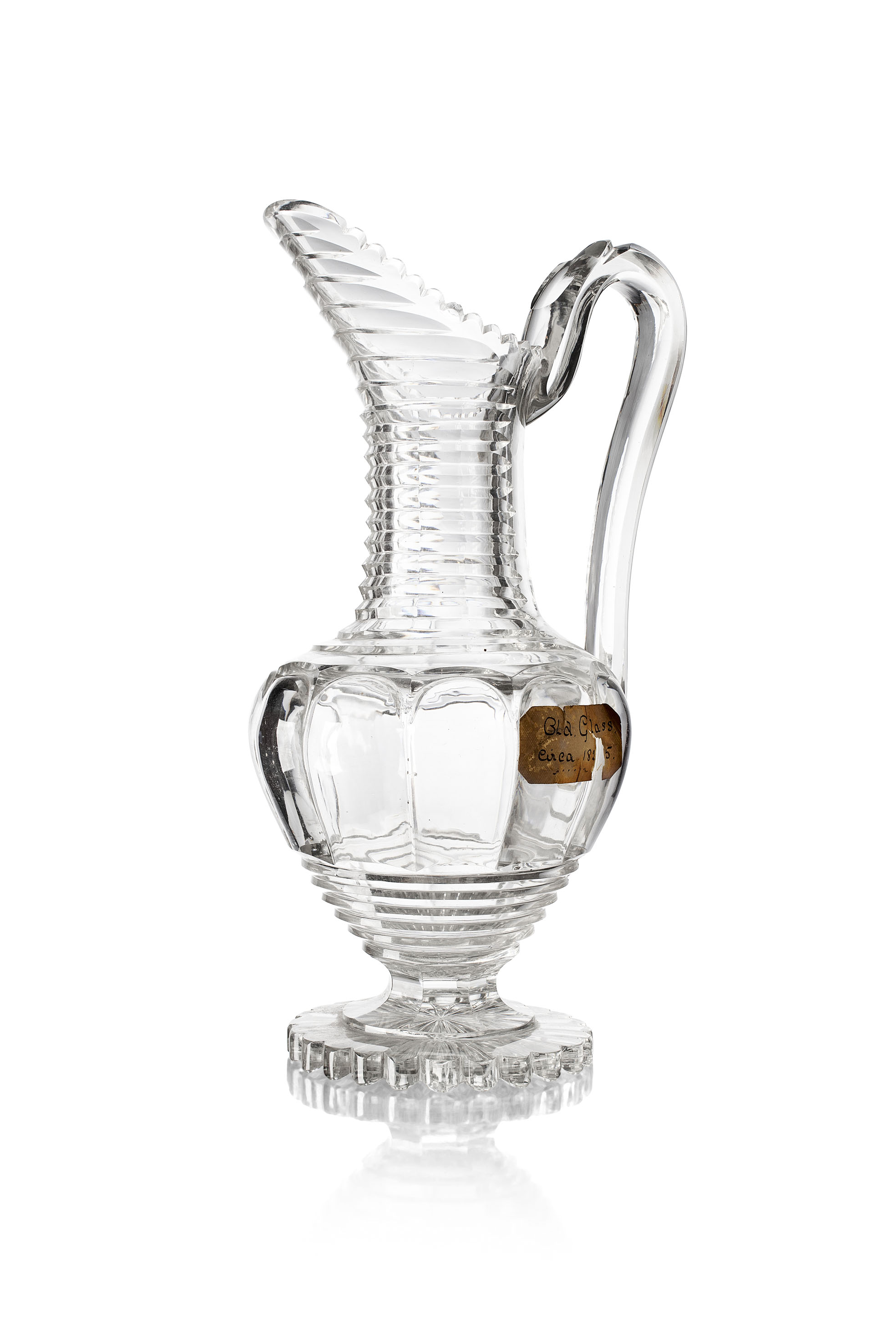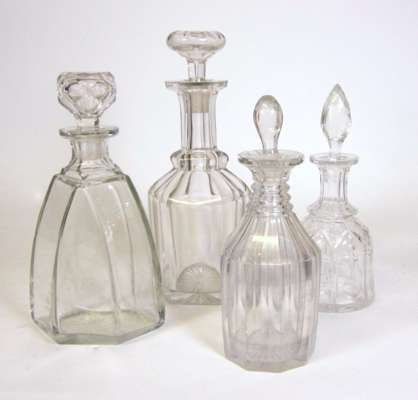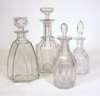 comprising a wine ewer with a barbed mouth and facetted neck, lobed body and loop handle, on a star cut foot; and four decanters of various shapes and sizes with associated stoppers (4)