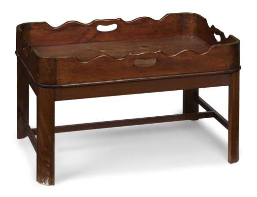 the rounded rectangular tray top with high sides and a serpentine edge with brass corner mounts and cut out hand holds to all sides, on a later stand with a H-form stretcher