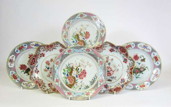 all painted with peonies amongst rockwork, one pair of lotus blossom form; together with two other Chinese export famille rose plates painted with flowers and fences (8)