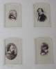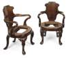 the cartouche shaped backs with a moulded edge leading to shepherd's crook arms, over a circular drop in seat, raised on cabriole legs carved with C scrolls and ending on pad feet (2)