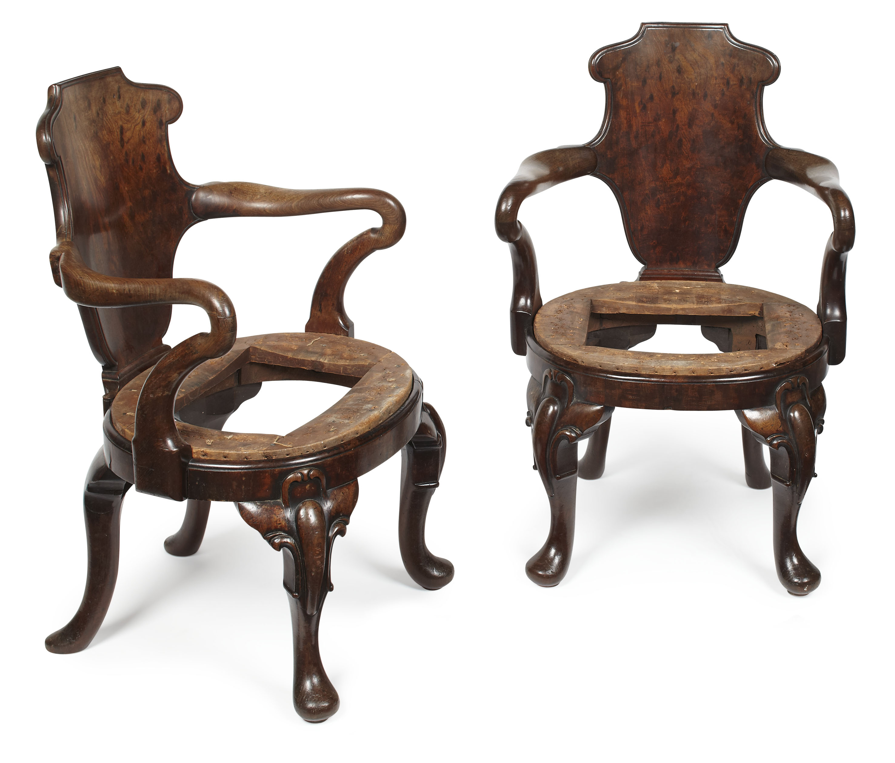 PAIR OF GEORGE II STYLE WALNUT AND PLUM PUDDING MAHOGANY WRITING CHAIRS, POSSIBLY GILLOWS