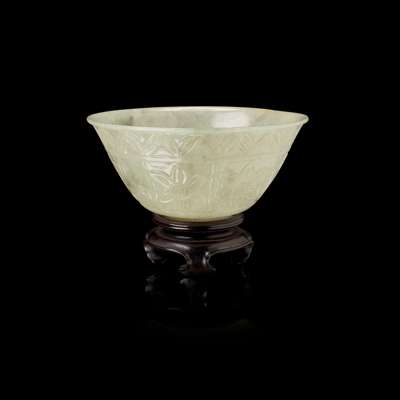 the tapering bowl with slightly everted lip and flared foot rim, finely carved throughout with borders of stylised flowerheads, foliage and simple gadrooning, with scroll carved wooden stand