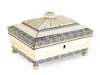 of sarcophagus form, the lobed hinged cover with a flowerhead finial and foliate engraved bands, opening to reveal a compartmented fitted interior, raised on lobed bun feet