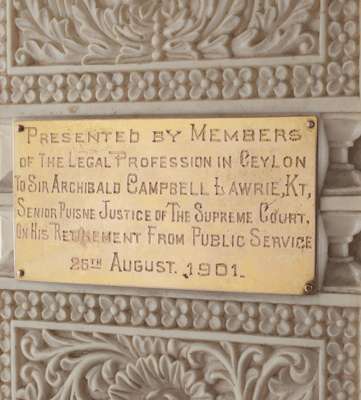 Bears gilt metal plaque: 'Presented by Members of The Legal Profession in Ceylon, to Sir Archibald Campbell Lawerie, Kt, Senior Puisne Justice of The Supreme Court, On His Retirement From Public Service, 25th August, 1901.