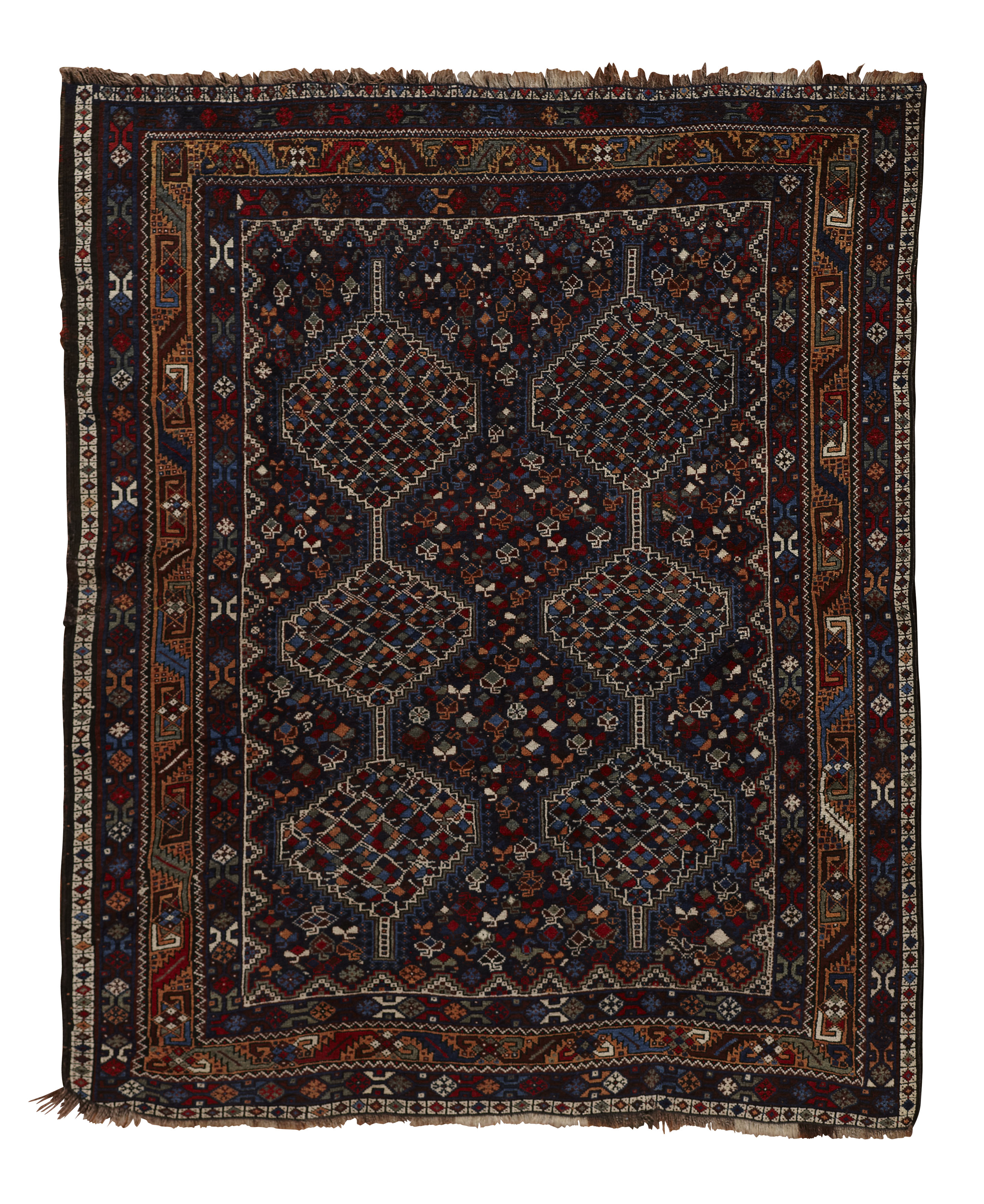 the indigo field with two columns of three linked polychrome medallions, within camel and indigo triple geometric borders