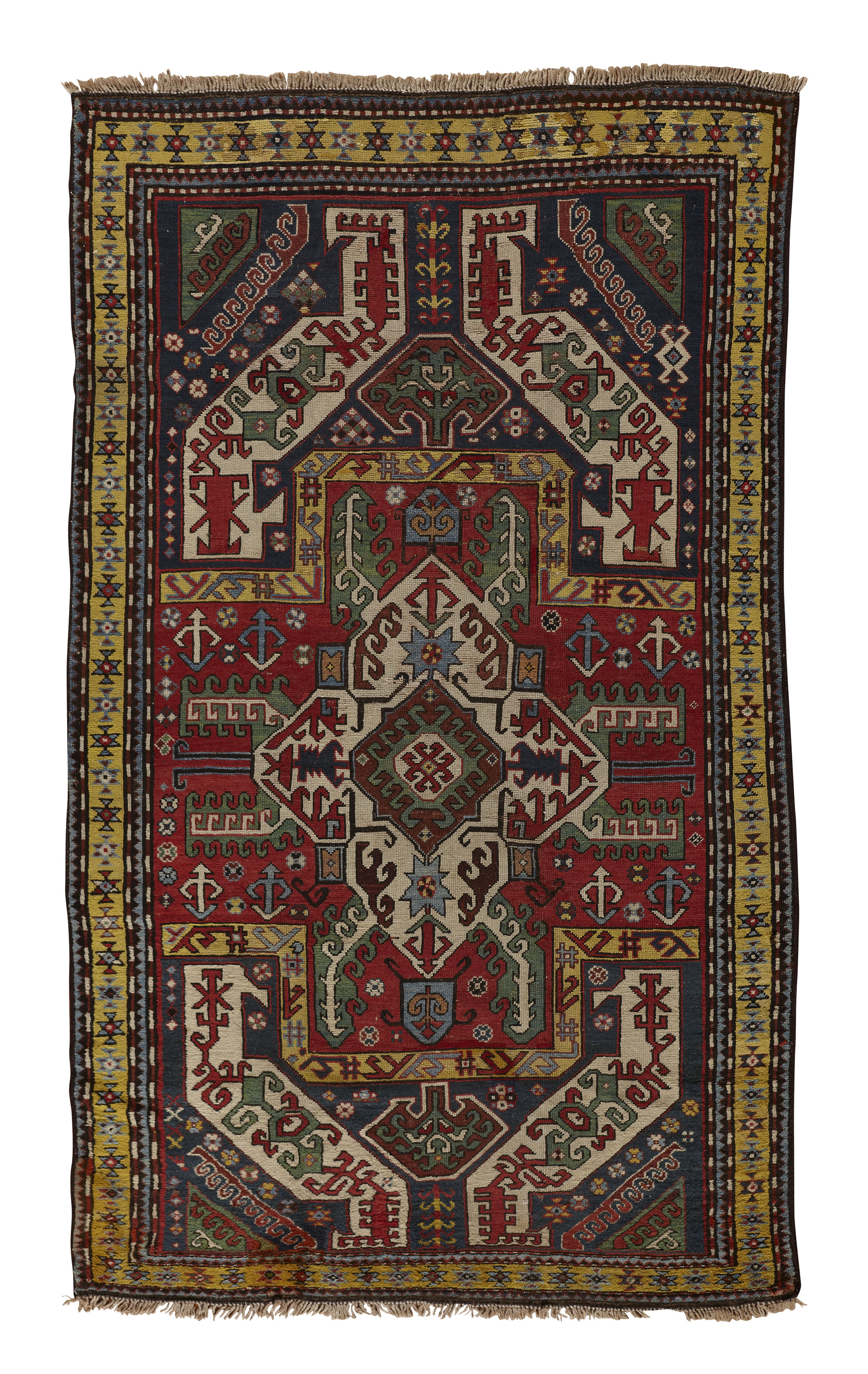 the red cross centre with ivory lozenge medallion, blue ends with ivory 'dragon' panels, within lemon star border between bands