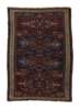 the dark indigo field with four indigo and reddish brown elongated serrated medallions, within ivory hooked motif border between bands