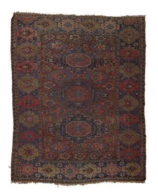 the brown field with three indigo and red lozenge medallions, within indigo lozenge border between bands