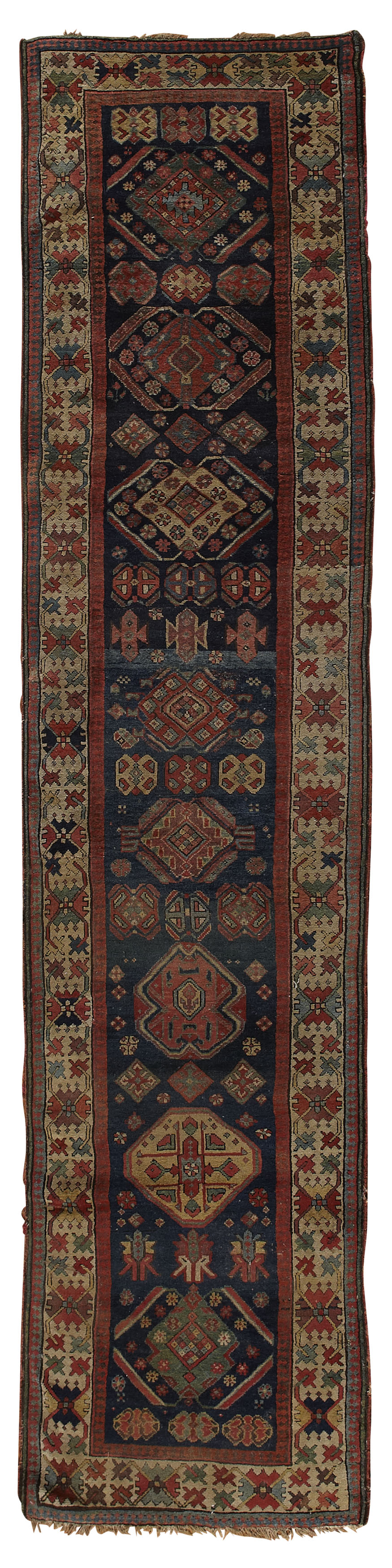the abrash indigo field with eight polychrome lozenge medallions, within cream harshang border between bands