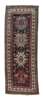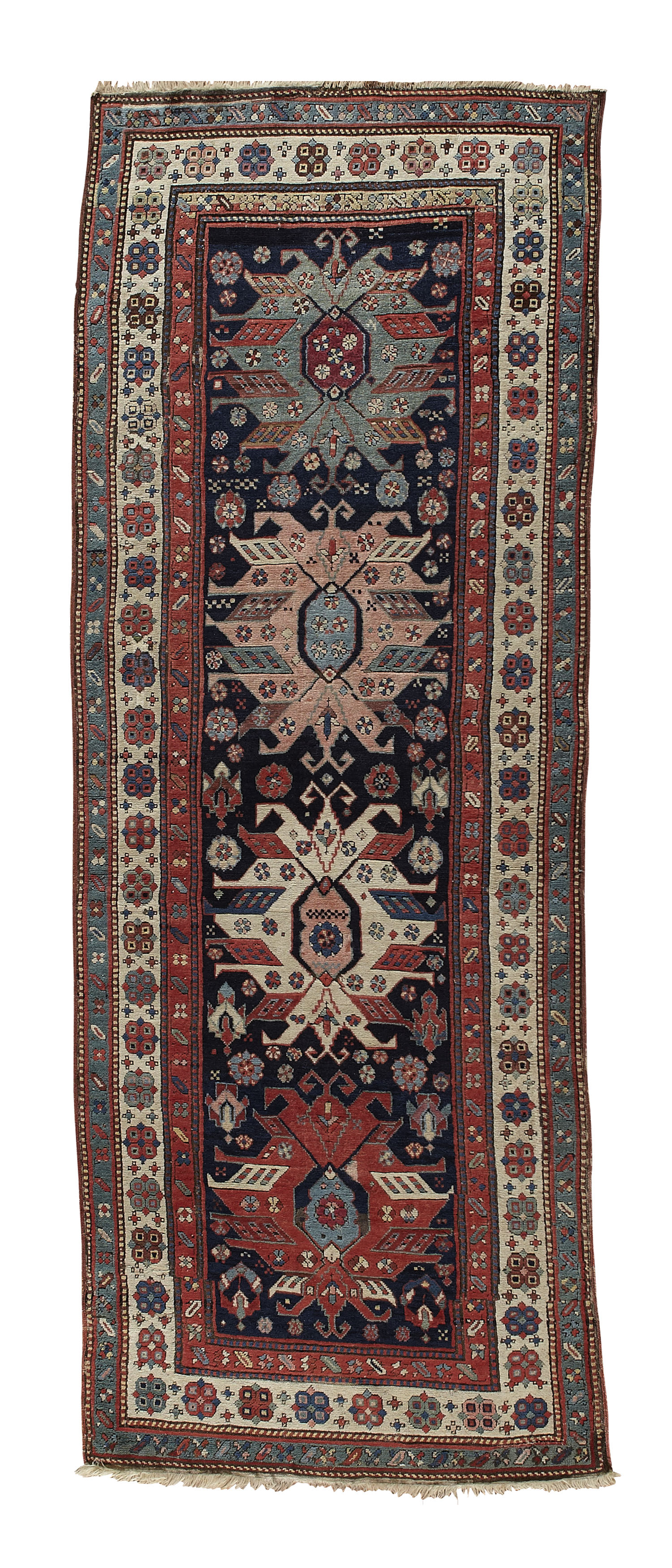 the indigo field with four polychrome shaped medallions, within ivory rosette border between red and green bands