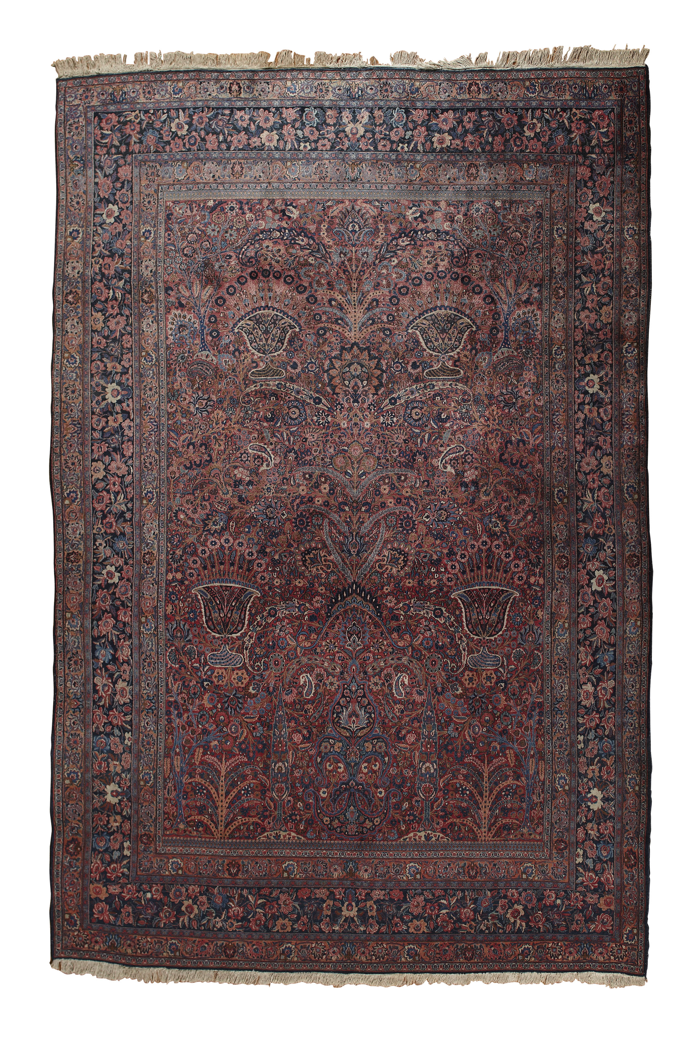 the raspberry field with allover floral urn, tree and foliate pattern, within indigo floral border between bands