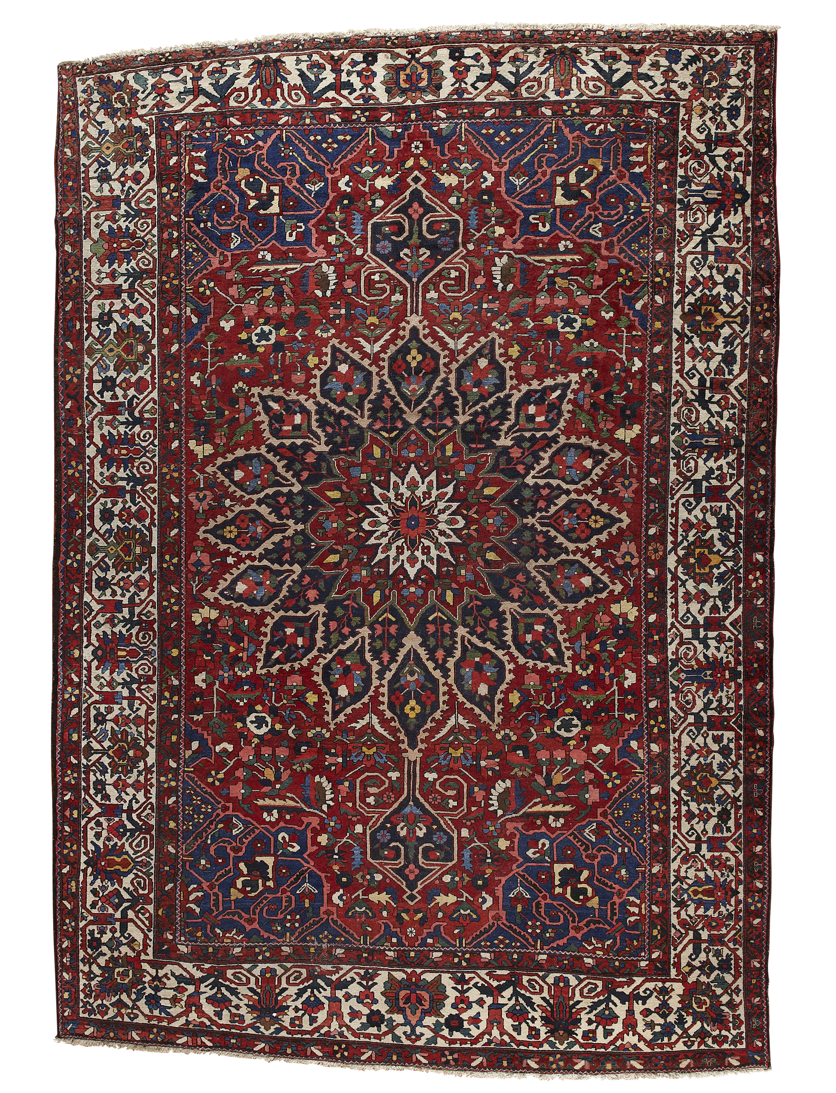 the red field with indigo, red and ivory large radiating medallion suspending pendants, indigo spandrels, within ivory palmette and stylised vine border between bands