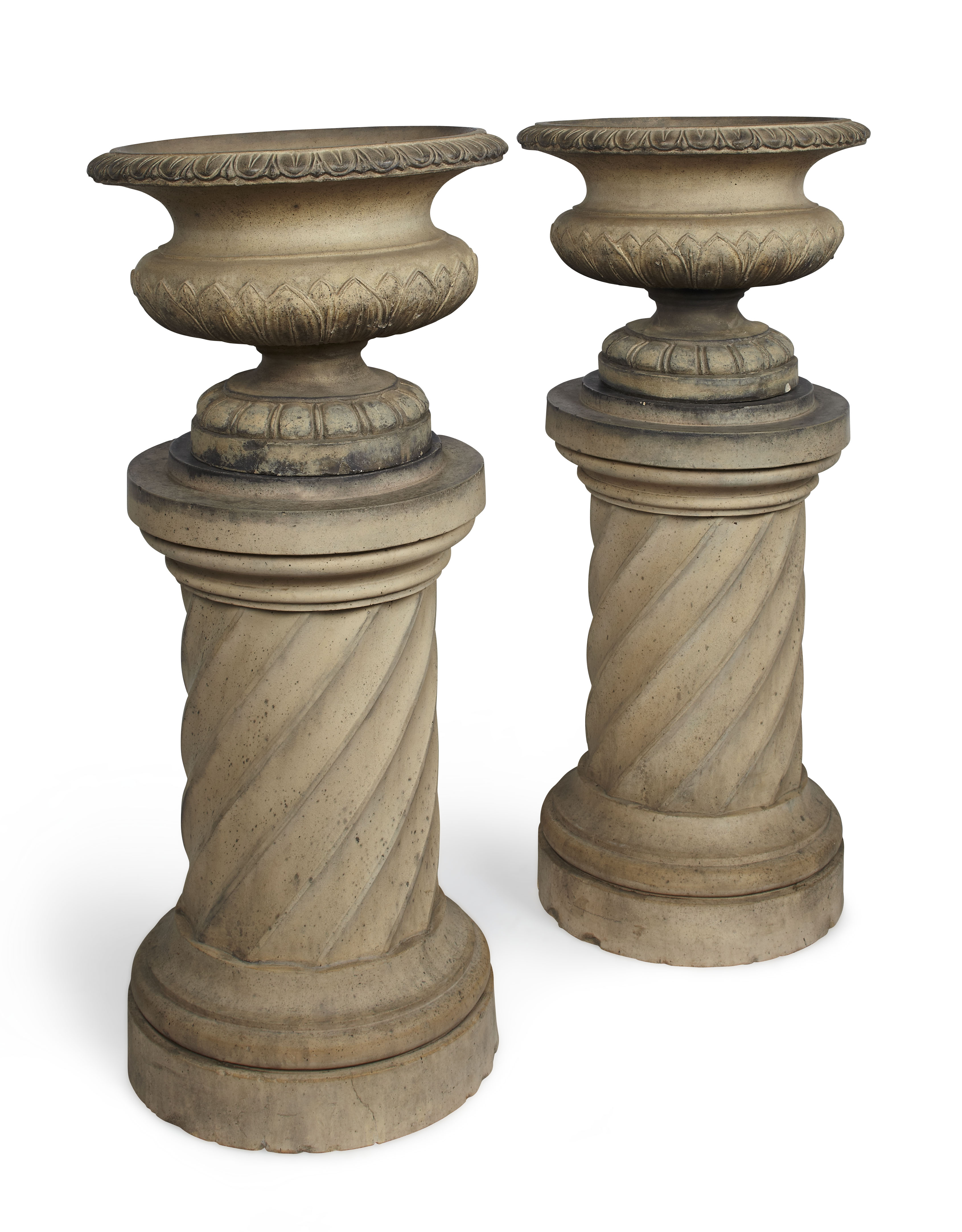 each of campana form moulded with leaf tips, on spiral column stands and moulded circular bases (2)