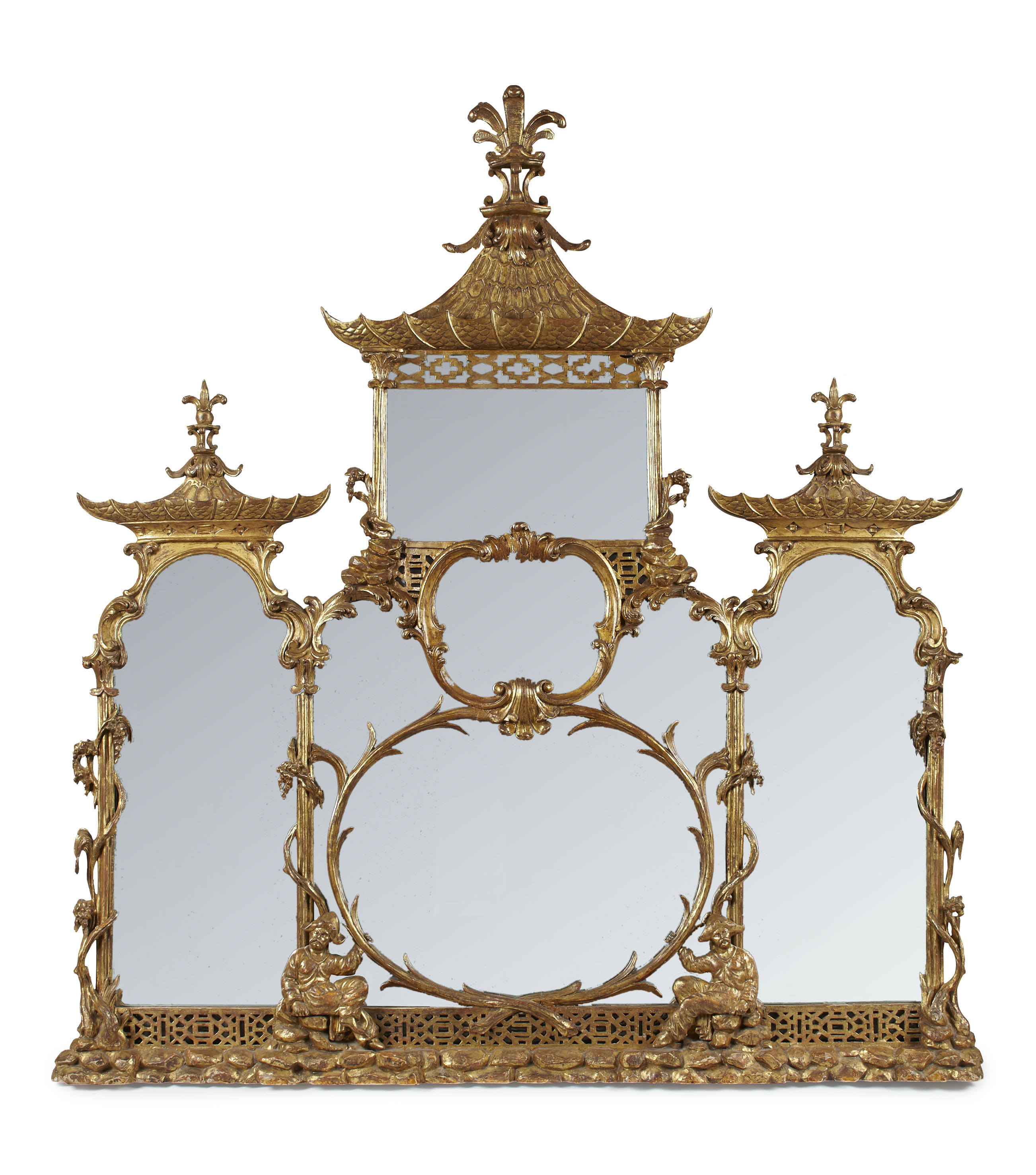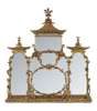 the blued mirror plates within an elaborate carved giltwood and gesso frame with pagodas, fruiting vines, fretwork and a pair of seated Chinese figures on a rockwork base