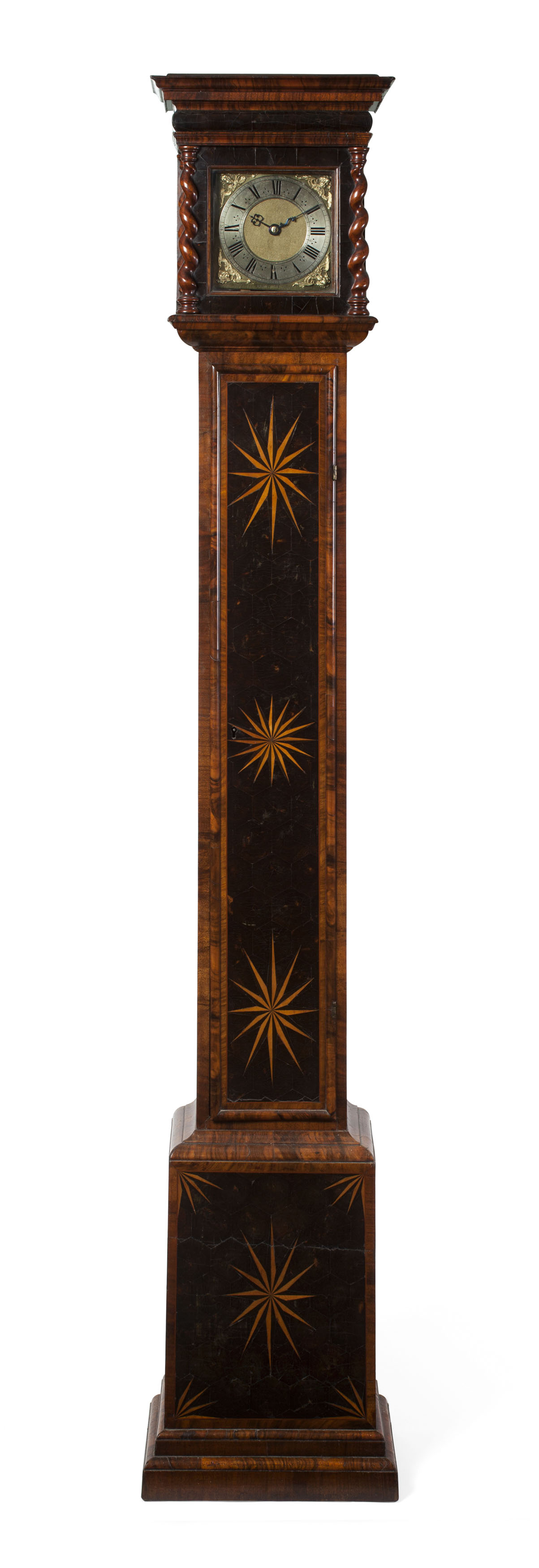 the later case hood with flat top hood and rectangular glazed side panels flanked by spiral twist columns, the rectangular door with boxwood and ebony star parquetry inlay, conforming parquetry to the step-moulded base, the 6 inch wide brass dial with winged cherub mask spandrels to silvered Roman and Arabic chapter ring with trident half hour markers, replaced blued steel hands, the movement on ball and spike feet with four ring-turned pillars, replaced knife edge verge escapement and countwheel strike on later bell