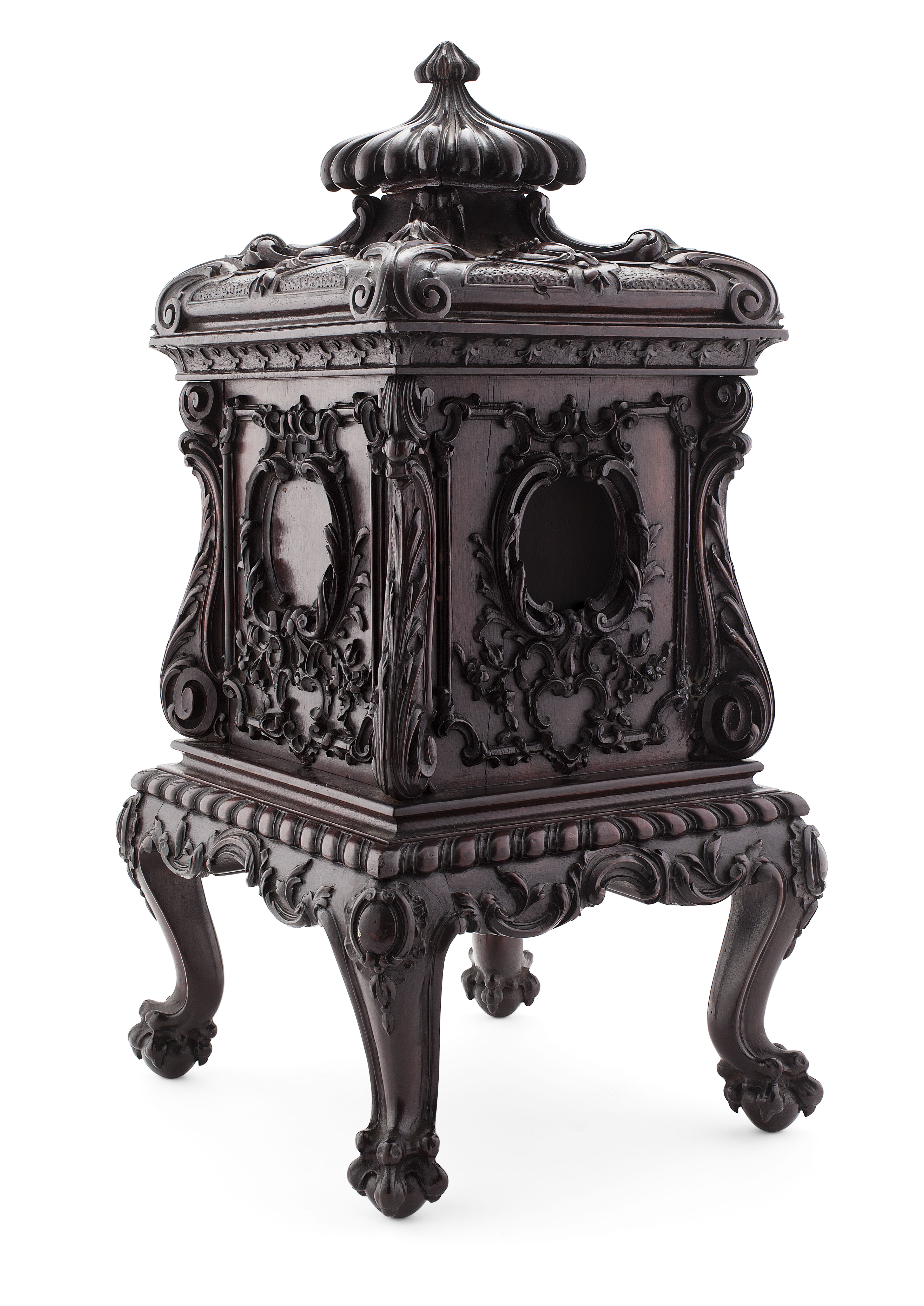 in the Chippendale manner, of pagoda form carved throughout with foliage, rococo scrolls and acanthus, the stand raised on moulded cabriole legs terminating in claw and ball feet