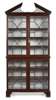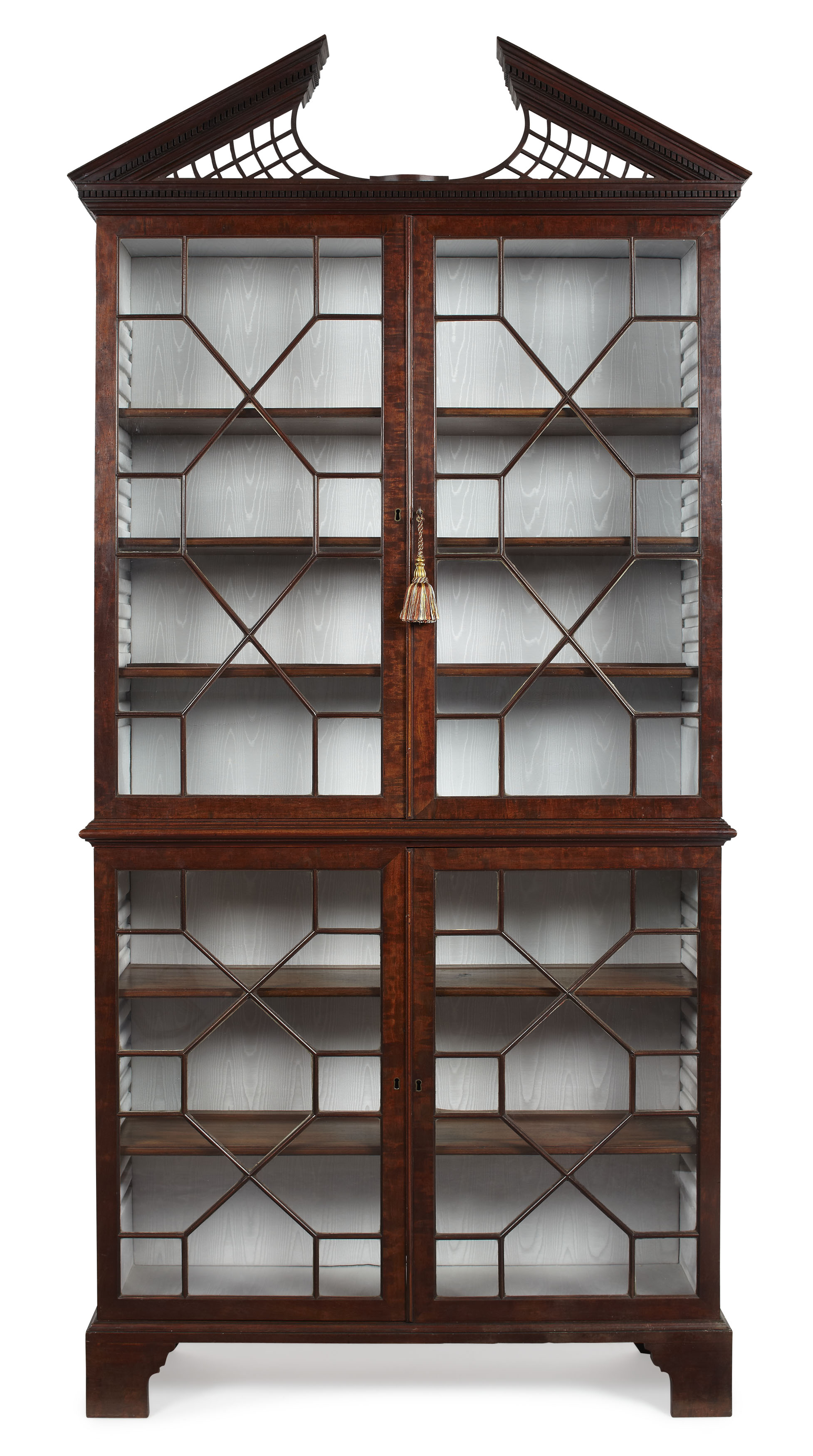 the broken arch pediment with trellis panels above a dentil moulded frieze, over a pair of astragal glazed doors open to a pale blue silk lined and shelved interior; the lower part similarly arranged, raised bracket feet