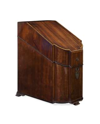 the slant hinged tops opening to interiors fitted for cutlery, over a serpentine front outlined in satinwood with silvered shield shaped escutcheons, on a moulded base raised on bracket feet (2)