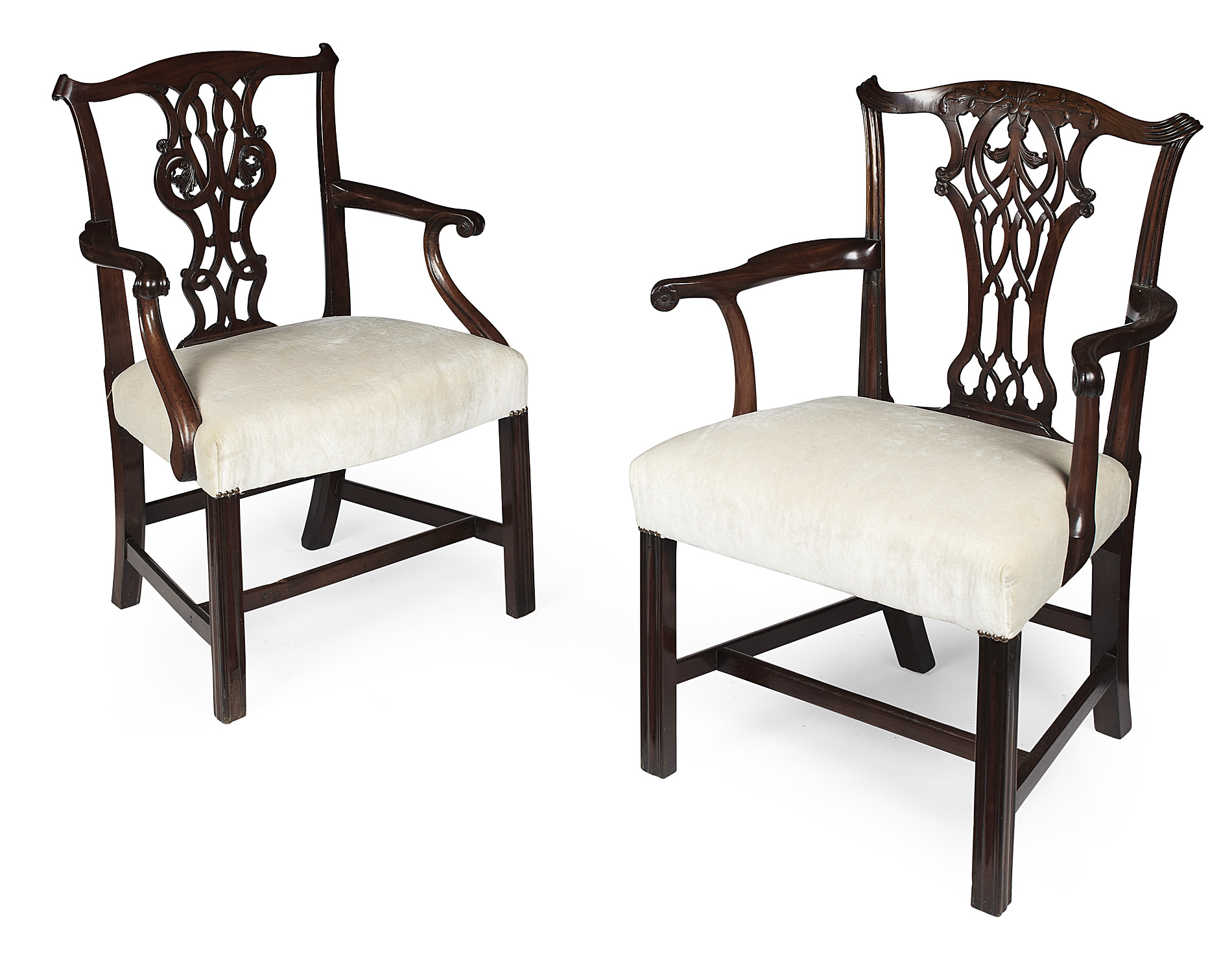 TWO GEORGE III MAHOGANY OPEN ARMCHAIRS