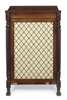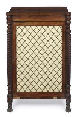 the rectangular top with outset corners above one grille panel door, opening to reveal a shelved interior, flanked by spiral turned pilasters and raised on brass paw feet