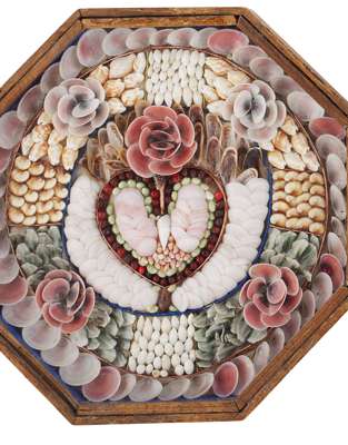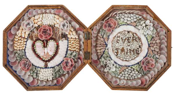 with two hexagonal hinged sides, one side worked with a love heart, the other entitled 'EVER THINE'
