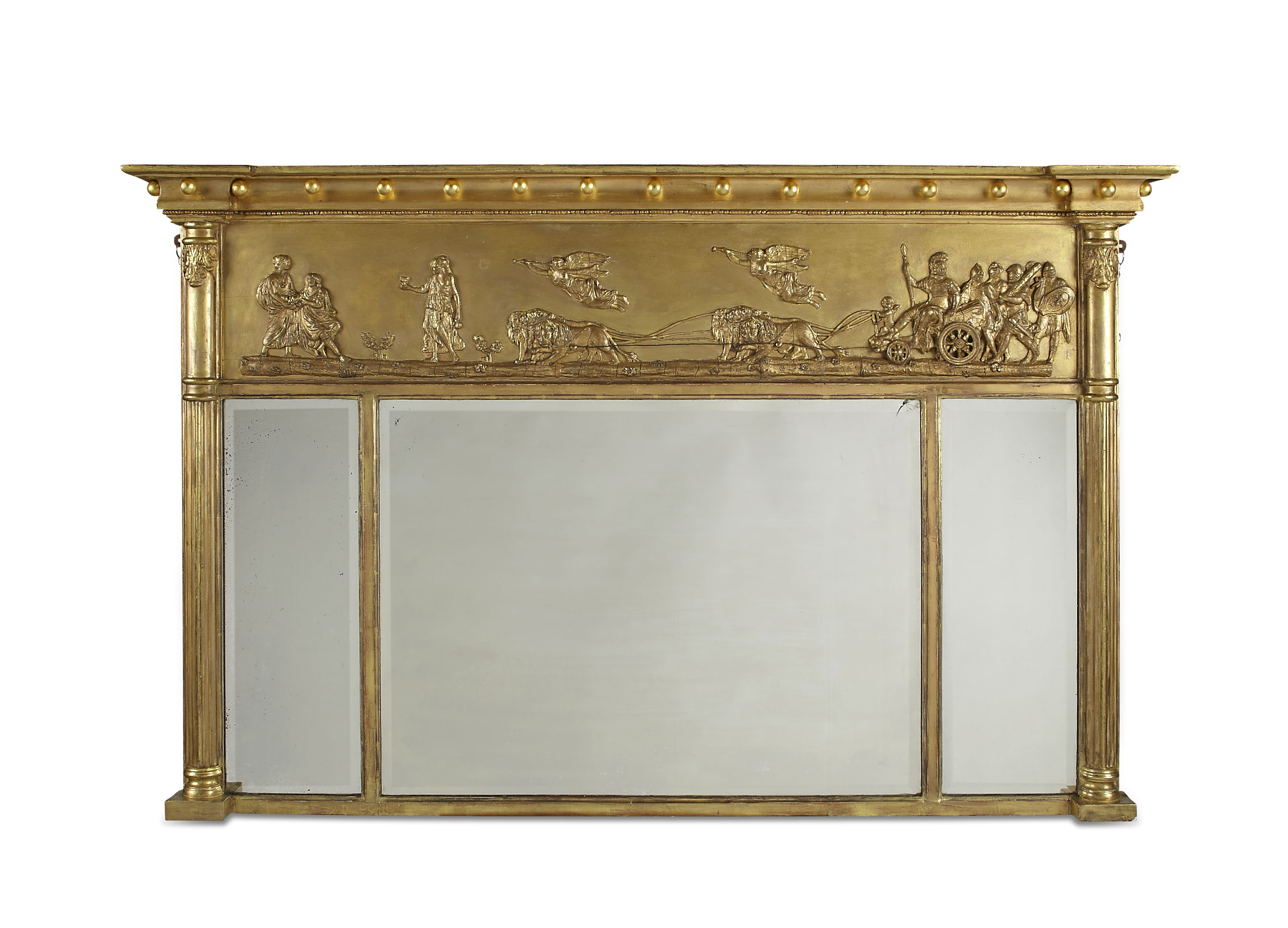 the relief moulded frieze depicting Chariot of Mars, above three divided mirror plates flanked by reeded pilasters