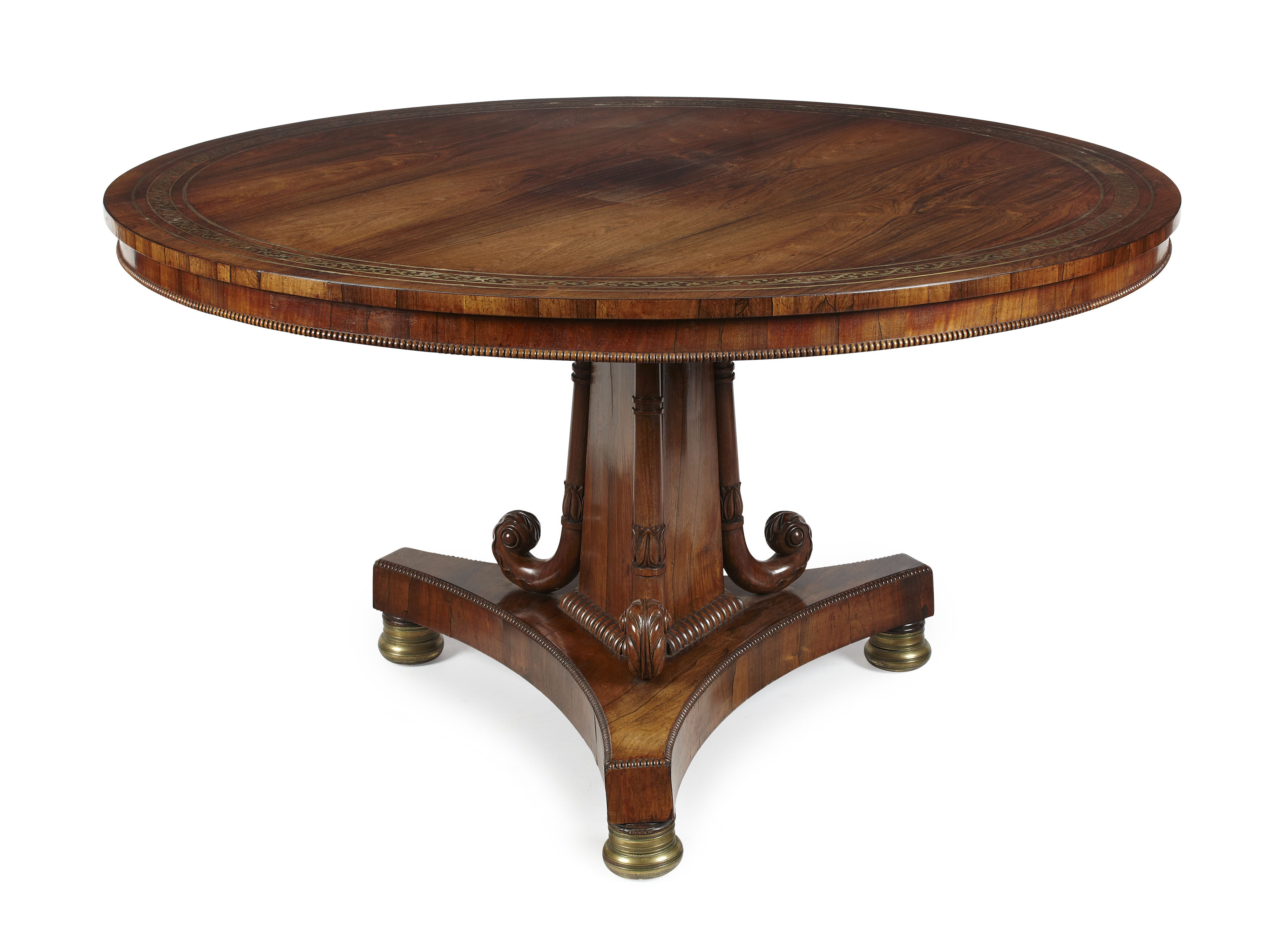 the circular tilt top inlaid in brass with a wide band of stylised foliate scrolls, over a frieze with a beaded edge, raised on a triform acanthus carved column support, ending in a triform base with brass bun feet
