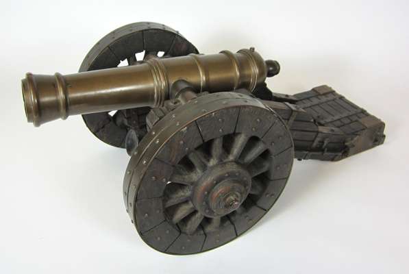 MINIATURE OAK AND BRASS CANNON